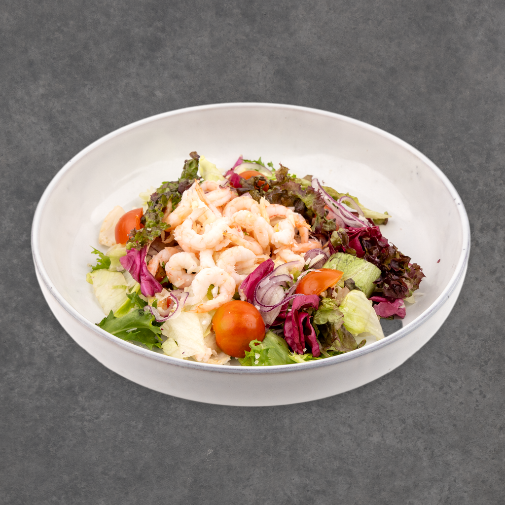 Isbergssallat, friséesallat, röd sallat, rosesallat, machesallat, tomat, rödlök, RÄKOR i lake 31% (RÄKOR* (Pandalus borealis), vatten, salt, surhetsreglerande medel (E330, E331)), Parmesan (opastöriserad MJÖLK, salt, löpe, konserveringmedel E1105 (från ägg)), Caesardressing: (rapsolja, vatten, opastöriserad italiensk HÅRDOST 3%, SENAPSFRÖ, ÄGGULA, salt, socker, citronkoncentrat, svartpeppar, vitlök, lök, ättika, glukossirap, vinäger, OSTPULVER, kryddor, stabiliseringsmedel (E415), surhetsreglerande medel (E330, E270), konserveringsmedel (E202, E211), arom e medel (E330, 2770), konserveringsmedel (E202, 2211).